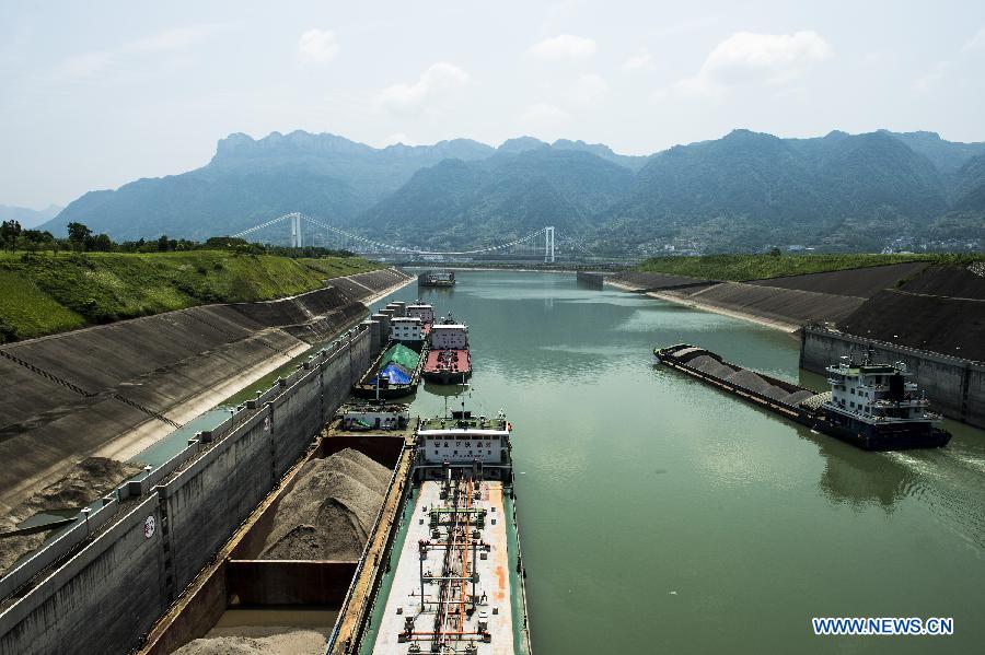 Ships sail on the lower reaches of the navigation lock of the Three Gorges in Yichang, central China's Hubei Province, May 30, 2015. The freight getting through the navigation lock of the Three Gorges has topped 34.28 million tons from January to April this year, up 5.77 percent compared with that of last year. (Xinhua/Zheng Jiayu)