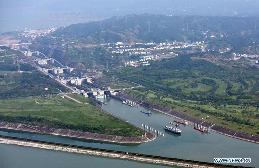 Ships pass the navigation lock of the Three Gorges in Yichang, central China's Hubei Province, May 30, 2015. The freight getting through the navigation lock of the Three Gorges has topped 34.28 million tons from January to April this year, up 5.77 percent compared with that of last year. (Xinhua/Wang Jiaman)