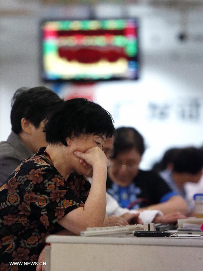 Investors look through stock information at a trading hall in a securities firm in Shanghai, east China, June 19, 2015. Chinese stocks plunged on Friday, with the benchmark Shanghai Composite Index diving 6.42 percent, to finish at 4,478.36 points. The Shenzhen Component Index plunged 6.03 percent, to close at 15,725.47 points. (Xinhua/Ding Ting)