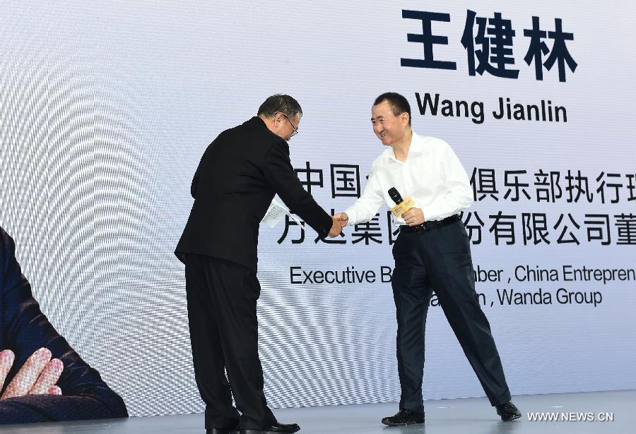 Liu Chuanzhi (L), founder and chairman of Legend Holdings, shakes hands with Chairman of Wanda Group Wang Jianlin during a business event with the theme of "Builders and Movers" held by Legend Holdings in Beijing, capital of China, July 7, 2015. Legend Holdings, the parent company of the world's largest PC maker Lenovo, had its stock listed on Hong Kong Stock Exchange on June 29, 2015. (Xinhua/Jin Liangkuai)