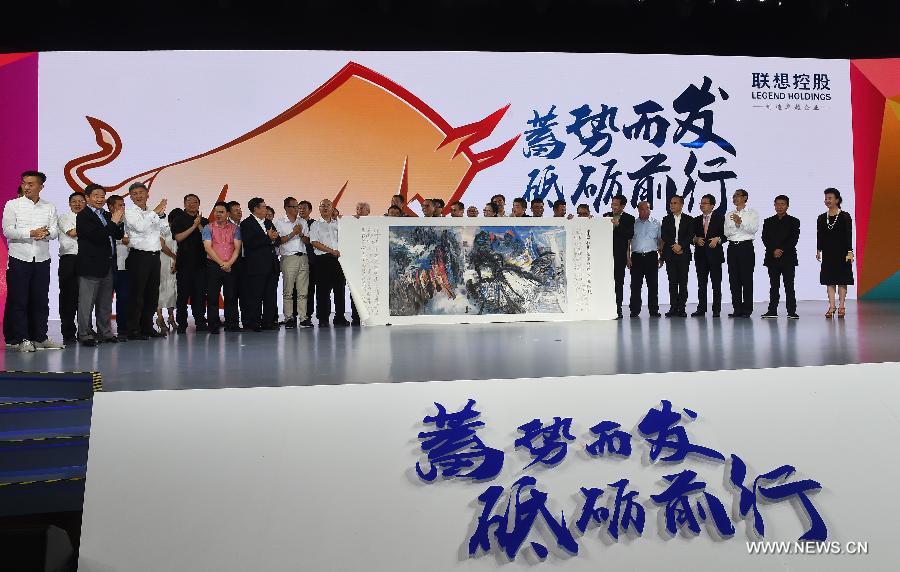 Entrepreneurs present a gift to Liu Chuanzhi, founder and chairman of Legend Holdings, during a business event with the theme of "Builders and Movers" held by Legend Holdings in Beijing, capital of China, July 7, 2015. Legend Holdings, the parent company of the world's largest PC maker Lenovo, had its stock listed on Hong Kong Stock Exchange on June 29, 2015. (Xinhua/Jin Liangkuai)