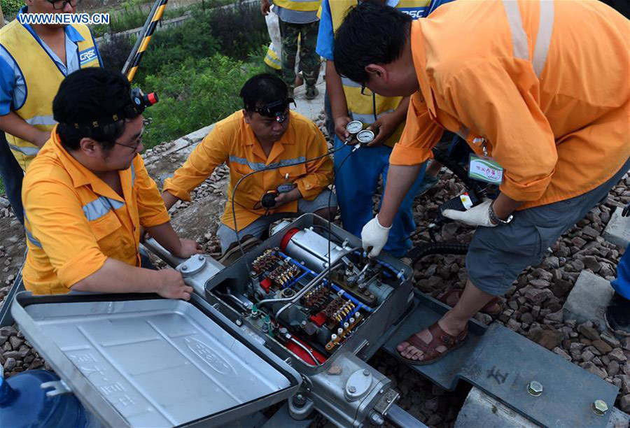 Railway staff members test signals at Caogusi circuit station of Zhengzhou Railway Signal Depot in Zhengzhou, capital of Central China's Henan province, on August 3, 2016, 2016. [Photo/Xinhua]