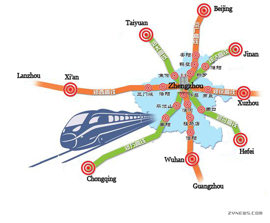The high-speed railway line connecting Beijing in the north and Guangzhou in the south meets with the line connecting Lanzhou in the west and Xuzhou in the east in Zhengzhou, making the city the most special one in the country's network.