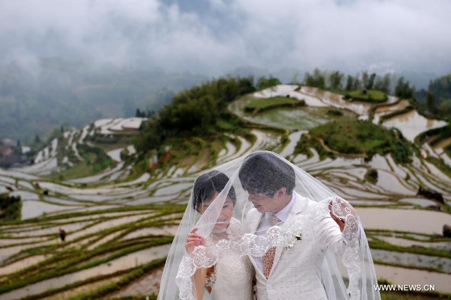 | A young couple pose for wedding photos with the terraced fields as background in Chongtou Town of Yunhe County in Lishui City, east China's Zhejiang Province, May 17, 2014. (Xinhua/Liang Zhen) |