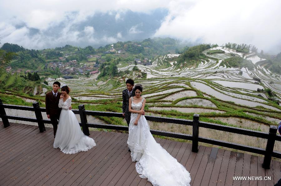 A young couple pose for wedding photos with the terraced fields as background in Chongtou Town of Yunhe County in Lishui City, east China's Zhejiang Province, May 17, 2014. (Xinhua/Liang Zhen)
