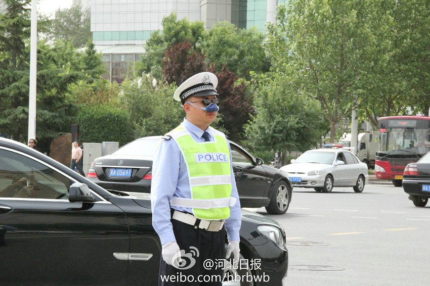 Recently, traffic policemen are equipped with the new devices, which can protect them from smog, in Shijiazhuang, capital of Hebei Province, according to weibo.com. (Photo Source: photo.news.cn/weibo.com)