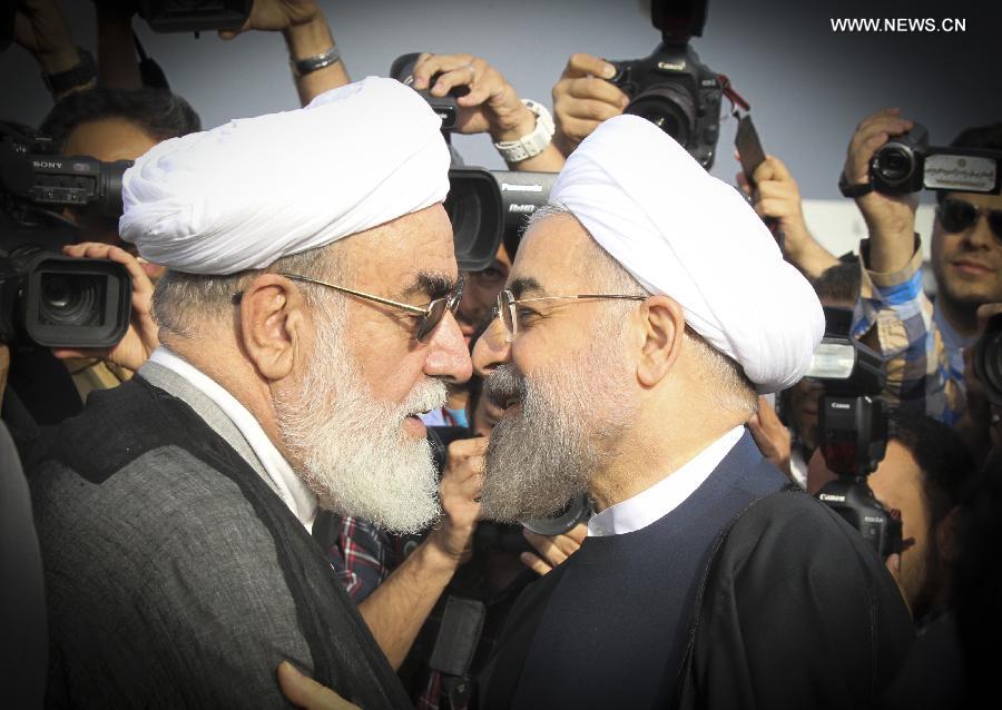 Iranian President Hassan Rouhani (R) greet the head of Iranian supreme leader's office, Mohammad Mohammadi Golpayegani (L) before leaving for China at Mehrabad Airport in Tehran, Iran, on May 20, 2014. Rouhani left Tehran for Shanghai on Tuesday morning to attend the Conference on Interaction and Confidence Building Measures in Asia (CICA) summit, to be held in Shanghai on May 20-21. (Xinhua/Ahmad Halabisaz)