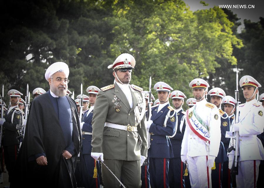 | Iranian President Hassan Rouhani (L) inspects the honour guards before leaving for China at Mehrabad Airport in Tehran, Iran, on May 20, 2014. Rouhani left Tehran for Shanghai on Tuesday morning to attend the Conference on Interaction and Confidence Building Measures in Asia (CICA) summit, to be held in Shanghai on May 20-21. (Xinhua/Ahmad Halabisaz) |