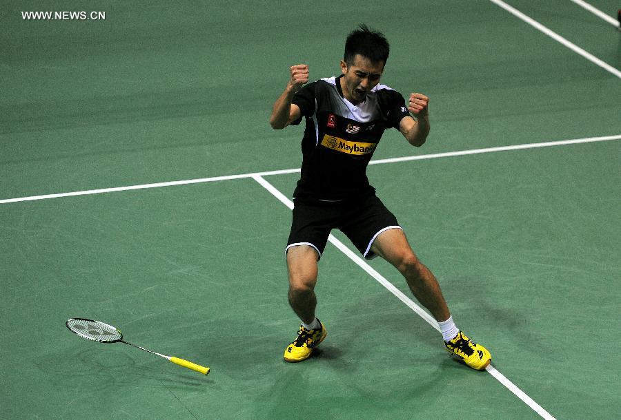 Wei Feng Chong of Malaysia celebrates victory during the Thomas Cup Group C match against Dieter Domke of Germany at the Siri Fort Stadium in New Delhi, India, May 19, 2014. Wei Feng Chong won 2-1. (Xinhua/Partha Sarkar)