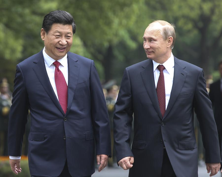 | Chinese President Xi Jinping (L) holds a welcoming ceremony for Russian President Vladimir Putin before their talks in Shanghai, east China, May 20, 2014. (Xinhua/Lan Hongguang) |