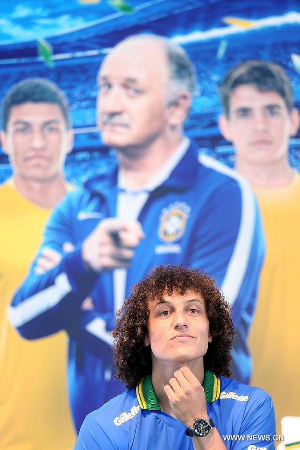 David Luiz of the Brazilian national soccer team reacts during a press conference of a promotional event in Sao Paulo, Brazil, on May 20, 2014. (Xinhua/Rahel Patrasso)