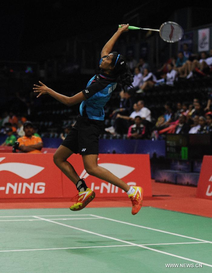 P.V. Sindhu of India returns a shot to Porntip Buranaprasertsuk of Thailand during the Uber Cup Group Y match at Siri Fort Stadium in New Delhi, India, May 20, 2014. P.V. Sindhu won 2-0. (Xinhua/Partha Sarkar)