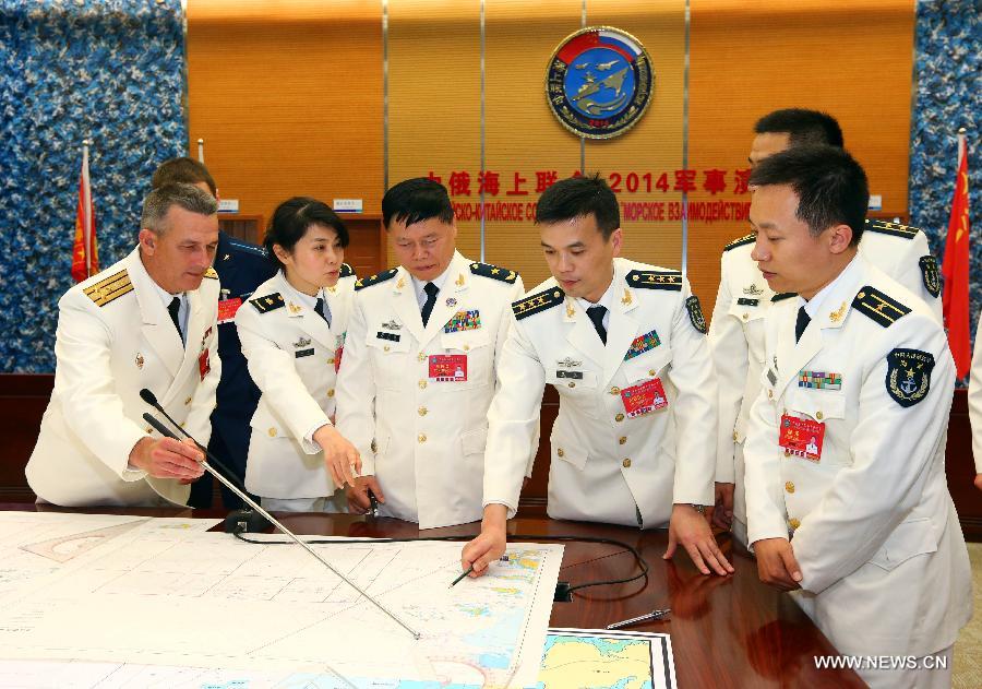 Directors of the Chinese and Russian naval forces arrange the deployment of forces in Shanghai, east China, May 20, 2014. The week-long China-Russia "Joint Sea-2014" exercise kicked off on Tuesday. A total of 14 vessels, two submarines, nine fixed-wing aircraft as well as helicopters and special forces from both sides will take part in the exercise. (Xinhua/Zha Chunming)
