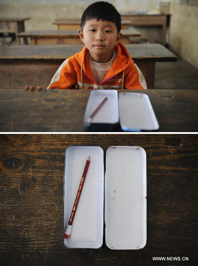 This photo combination shows second-grade student Wu Yunhao (above) and the inside of his pencil box (below) at Baimiao Elementary School in Sanquan Town of Nanchuan District, southwest China's Chongqing Municipality, May 20, 2014. Most of the 45 students enrolled in Baimiao Elementary School are left-behind children from nearby rural areas whose parents make a living as migrant workers in cities. For years, the students here have been faced with insufficient educational supplies, notably stationery. (Xinhua/Li Jian)