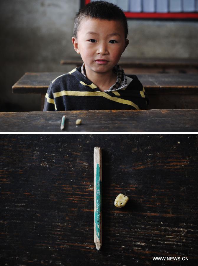 This photo combination shows second-grade student Zhu Xingyu (above) along with his pencil and rubber (below) at Baimiao Elementary School in Sanquan Town of Nanchuan District, southwest China's Chongqing Municipality, May 20, 2014. Most of the 45 students enrolled in Baimiao Elementary School are left-behind children from nearby rural areas whose parents make a living as migrant workers in cities. For years, the students here have been faced with insufficient educational supplies, notably stationery. (Xinhua/Li Jian)