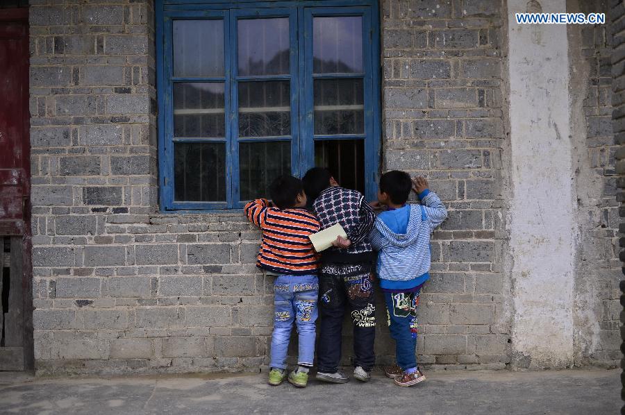 Three preschool kids look into a classroom of Liyuan Elementary School in Xikeng Village under Wanzai County of Yichun, east China's Jiangxi Province, May 20, 2014. The lack of trained teachers has been a ubiquitous problem that bothers many elementary schools in rural China. Education authorities of Wanzai County have launched a five-year teacher training program in 2014 to address the demand for teachers in the county's rural areas. Each year, the program will receive 30 junior high applicants who are from rural areas. Half of the applicants are required to work in rural schools when they finish the program. (Xinhua/Zhou Mi)