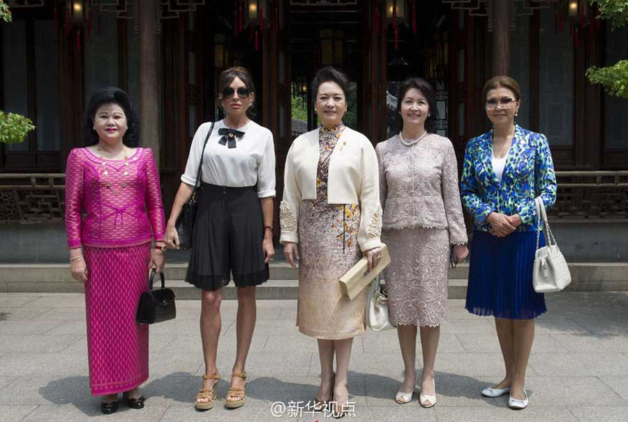 Peng Liyuan(C), wife of Chinese President Xi Jinping and her counterparters pose for a photo as they visit the Yuyuan Garden in Shanghai. Chinese first lady Peng Liyuan invited her counterparts to enjoy China's traditional arts and culture in the centuries-old Yuyuan Garden on Wednesday.[Photo/Xinhua]