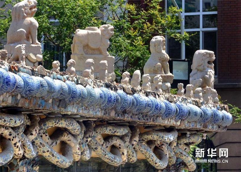 A shrine made of porcelain fragments in front of China House shows damaged ancient stone statues. [Photo/Xinhua]