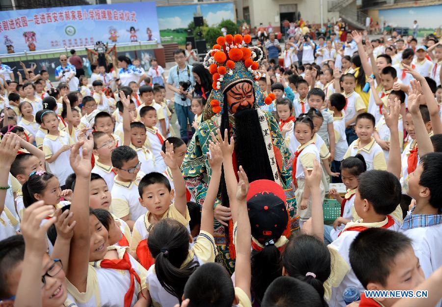 | A Peking opera actor interacts with pupils during an event "Peking Opera Comes to Campus" at Haojiaxiang Elementary School in Xi'an, capital of north China's Shaanxi Province, May 22, 2014. (Xinhua/Li Yibo) |