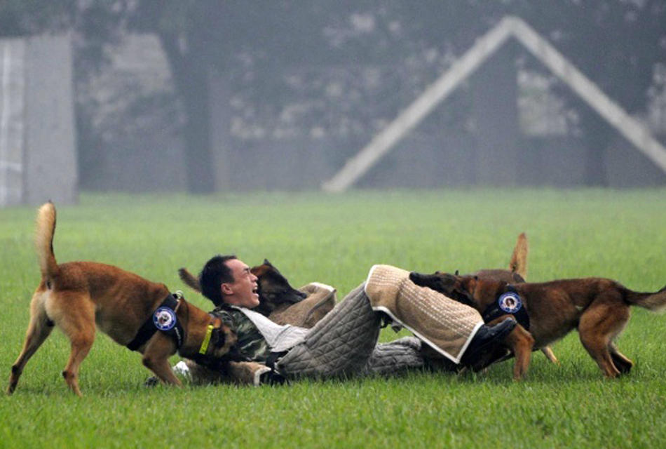 82 police dogs from across the country compete in a canine combat skill competition with their trainer in Foshan, Guangzhou province on May 20, 2014. The three-day-long competition contained seven games for different kinds of police dogs. (Photo/ Guangzhou Daily)