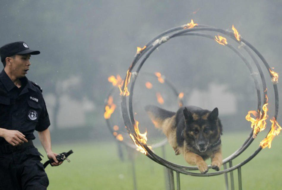 82 police dogs from across the country compete in a canine combat skill competition with their trainer in Foshan, Guangzhou province on May 20, 2014. The three-day-long competition contained seven games for different kinds of police dogs. (Photo/ Guangzhou Daily)