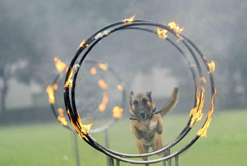 82 police dogs from across the country compete in a canine combat skill competition with their trainer in Foshan, Guangzhou province on May 20, 2014. The three-day-long competition contained seven games for different kinds of police dogs. (Photo/ Guangzhou Daily)