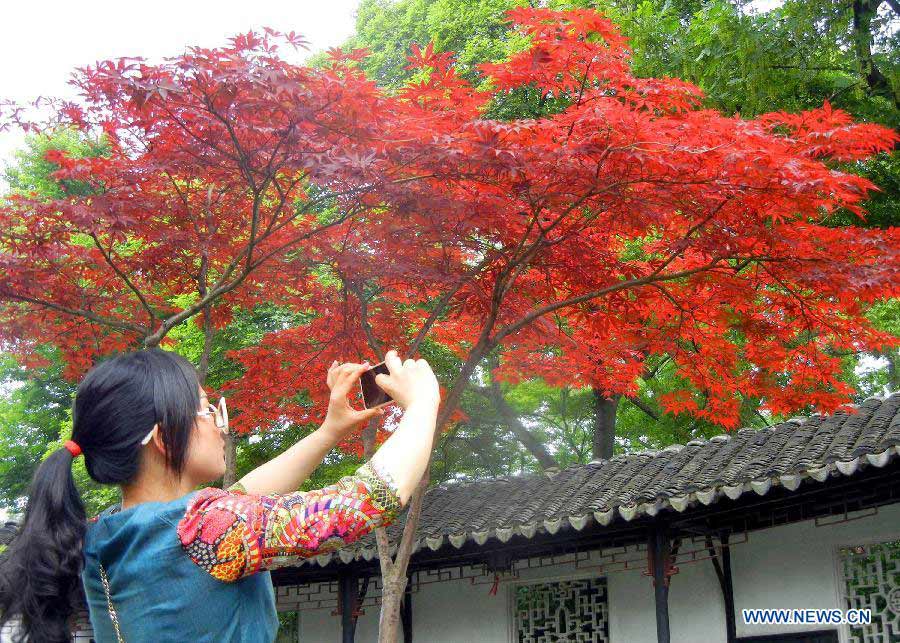 A visitor takes photos of Japanese maples at the Zhuozhengyuan Garden in Suzhou City, east China's Jiangsu Province, May 22, 2014. (Xinhua/Wang Jiankang)