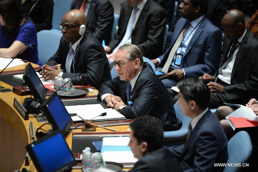 UN Deputy Secretary-General Jan Eliasson (C) speaks before the Security Council votes on a draft resolution on Syria, at the UN headquarters in New York, on May 22, 2014. Russia and China, two permanent members of the UN Security Council, on Thursday used their veto power over a draft resolution intended to refer the Syrian civil war to the International Criminal Court (ICC). (Xinhua/Niu Xiaolei)