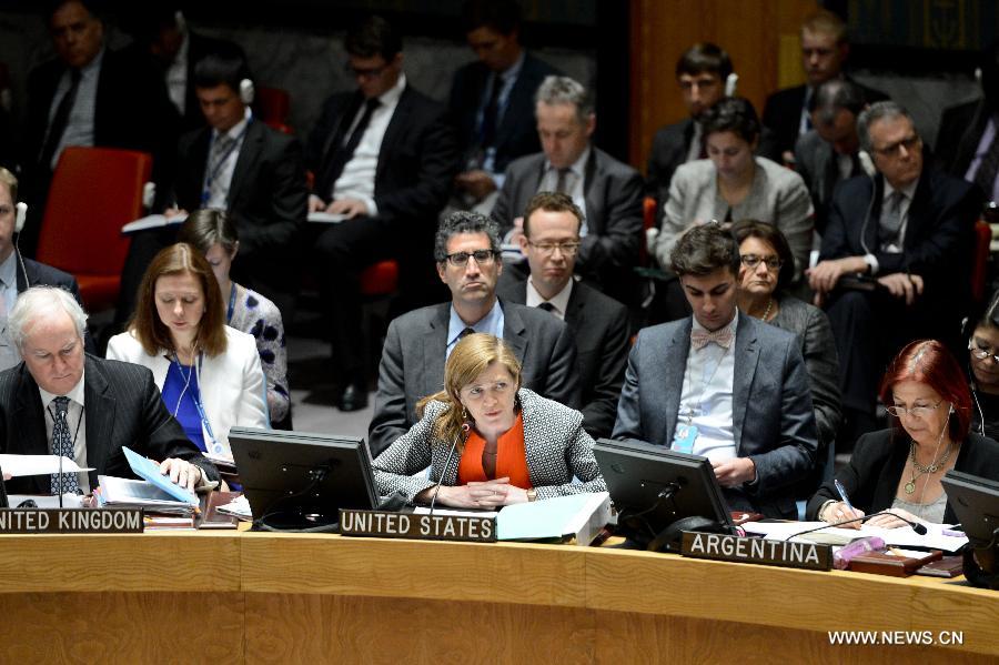 Samantha Power (C), U.S. permanent representative to the United Nations, speaks after the Security Council votes on a draft resolution on Syria, at the UN headquarters in New York, on May 22, 2014. Russia and China, two permanent members of the UN Security Council, on Thursday used their veto power over a draft resolution intended to refer the Syrian civil war to the International Criminal Court (ICC). (Xinhua/Niu Xiaolei)