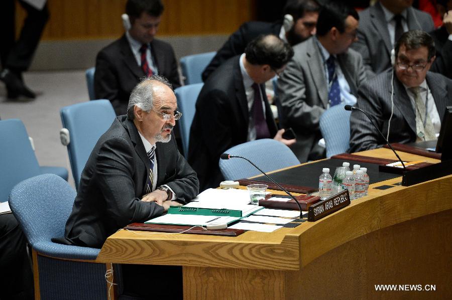 Bashar Ja'afari (1st L), Syria's permanent representative to the United Nations, speaks after the Security Council voted on a draft resolution on Syria, at the UN headquarters in New York, on May 22, 2014. Russia and China, two permanent members of the U.N. Security Council, on Thursday used their veto power over a draft resolution intended to refer the Syrian civil war to the International Criminal Court (ICC). (Xinhua/Niu Xiaolei)