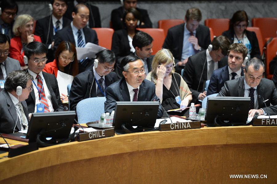 Wang Min (C), China's deputy permanent representative to the United Nations, speaks after the Security Council voted on a draft resolution on Syria, at the UN headquarters in New York, on May 22, 2014. Russia and China, two permanent members of the U.N. Security Council, on Thursday used their veto power over a draft resolution intended to refer the Syrian civil war to the International Criminal Court (ICC). (Xinhua/Niu Xiaolei)