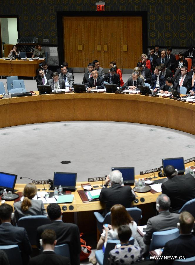 Wang Min (top center), China's deputy permanent representative to the United Nations, speaks after the Security Council voted on a draft resolution on Syria, at the UN headquarters in New York, on May 22, 2014. Russia and China, two permanent members of the U.N. Security Council, on Thursday used their veto power over a draft resolution intended to refer the Syrian civil war to the International Criminal Court (ICC). (Xinhua/Niu Xiaolei)