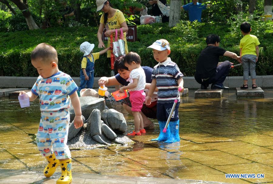 Citizens enjoy themselves at Wulongtan Park in Jinan, capital of east China's Shandong Province, May 22, 2014. A high temperature reaching over 35 Celsius degrees hit the city on Thursday. (Xinhua/Xu Suhui)