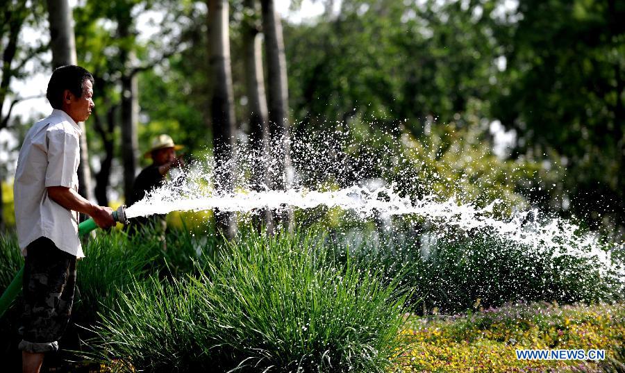A worker waters a grassplot at the Water Park in Tianjin, north China, May 22, 2014. The highest temperature reaches 36 degrees Celsius in Tianjin on Thursday. (Xinhua/Yue Yuewei)