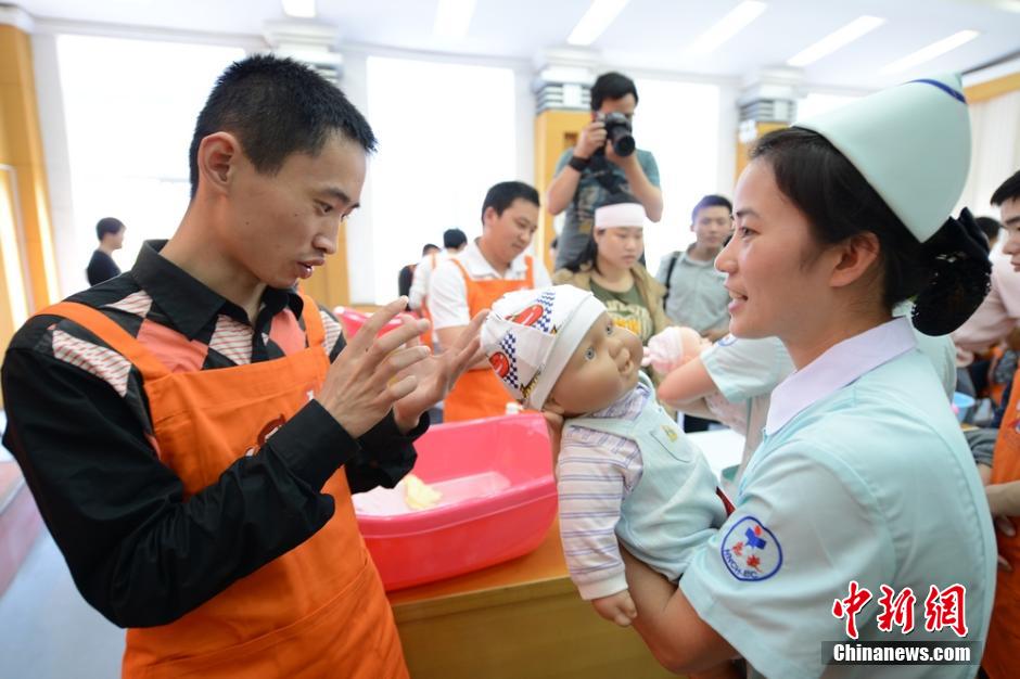 A total of 40 new and expectant fathers attend the super daddy training camp at Hunan Children's Hospital in Changsha, central China's Hunan province, May 23, 1014. They would learn baby nurturing skills in a short time under the guidance of paediatricians, including how to feed, bathe and swaddle babies and change loaded diapers.(Chinanews/Yang Huafeng)