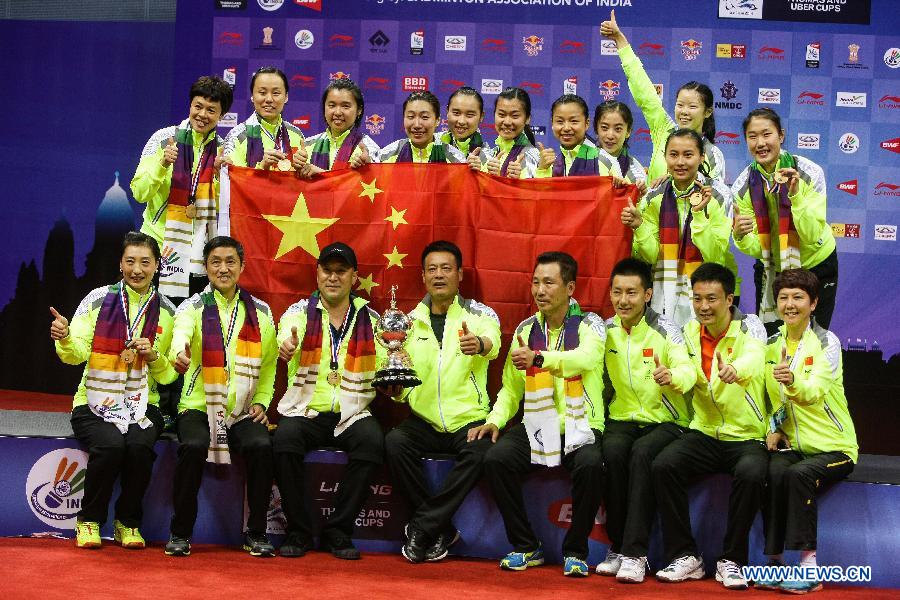 Members of Chinese women's team pose during the awarding ceremony for the Uber Cup badminton championship in New Delhi, capital of India, May 24, 2014. China claimed the title of the event by beating Japan in the final 3-1. (Xinhua/Zheng Huansong)