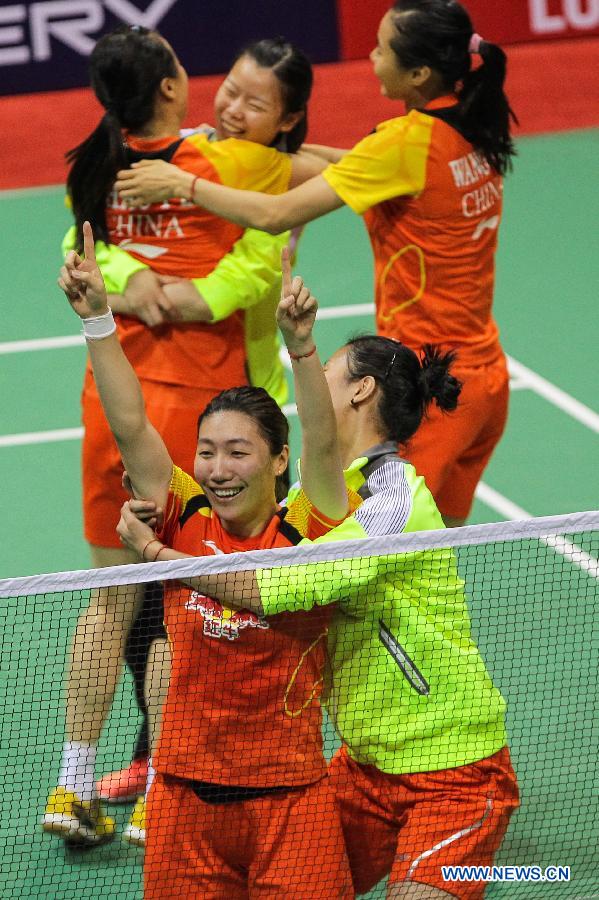 Chinese women's team celebrate after winning the final against Japan at the Uber Cup badminton championship in New Delhi, capital of India, May 24, 2014. China claimed the title of the event by beating Japan in the final 3-1. (Xinhua/Zheng Huansong)
