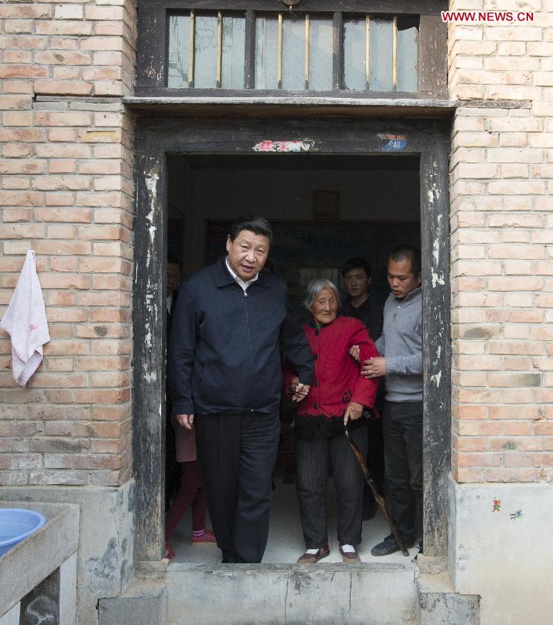 Chinese President Xi Jinping (L), also general secretary of the Communist Party of China (CPC) Central Committee, visits Zhang Jingzhi (C), an 85-year-old senior villager, at Zhangzhuang Village in Lankao County, central China's Henan Province, March 17, 2014. The Communist Party of China (CPC) initiated the year-long campaign in June, 2013 to strengthen the "mass line", referring to a guideline under which the CPC is required to prioritize the interests of the people. (Xinhua/Li Xueren)