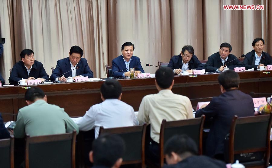 Liu Yunshan (3rd L, back), a member of the Standing Committee of the Political Bureau of the Communist Party of China (CPC) Central Committee, attends a meeting of the standing committee members of the local Party committee for the "mass line" educational campaign, in Liquan County, Xianyang, northwest China's Shaanxi Province, May 18, 2014. CPC initiated the year-long "mass line" campaign in June, 2013 to strengthen the "mass line", referring to a guideline under which the CPC is required to prioritize the interests of the people. (Xinhua/Li Tao)
