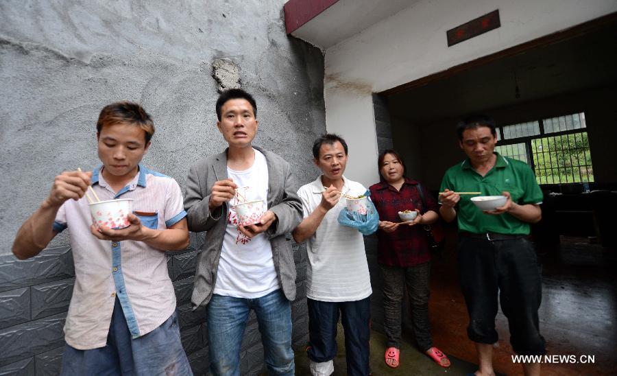Transferred residents eat supper at an evacuation point of the flooded Chengchong Village in Shangli County, east China's Jiangxi Province, May 25, 2014. Heavy rainstorms hit Shangli since Saturday, causing two deaths and forcing the relocation of around 84,500 people. (Xinhua/Zhou Ke)