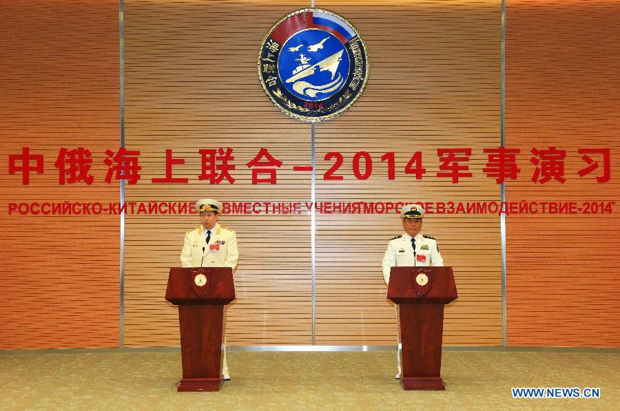 Tian Zhong (R), deputy commander of the Chinese Navy and the Chinese director of the "Joint Sea-2014", and Fedotenkov, deputy commander of Russian Navy and Russian director of the drill, attend the closing ceremony of the China-Russia joint naval drill in Shanghai, east China, May 26, 2014. The directors of two sides announced the end of the drill here on Monday. (Xinhua/Zha Chunming)