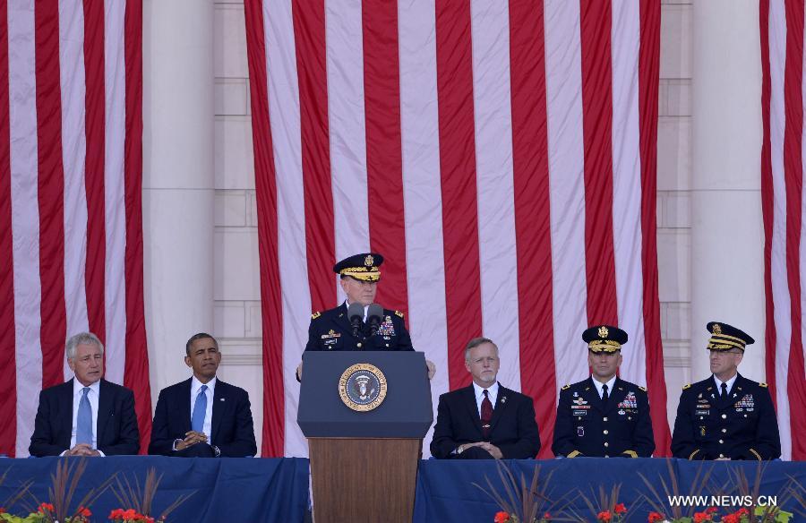 U.S. President Barack Obama (2nd L) and U.S. Secretary of Defense Chuck Hagel (1st L) listens as Chairman of the Joint Chiefs of Staff Army Martin Dempsey (3rd L) speaks at a Memorial Day event at Arlington National Cemetery, outside Washington D.C., the United States, May 26, 2014. (Xinhua/Yin Bogu)