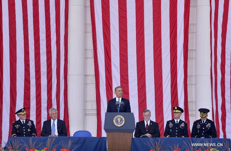 U.S. President Barack Obama (C) speaks at a Memorial Day event at Arlington National Cemetery, outside Washington D.C., the United States, May 26, 2014. (Xinhua/Yin Bogu)