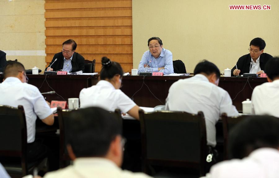 Yu Zhengsheng (C, back), chairman of the National Committee of the Chinese People's Political Consultative Conference and a member of the Standing Committee of the Political Bureau of the Communist Party of China (CPC) Central Committee, attends a meeting of the standing members of the local Party committee for the "mass line" educational campaign, in Wuding County, southwest China's Yunnan Province, May 19, 2014. The Communist Party of China (CPC) initiated the year-long campaign in June, 2013 to strengthen the "mass line", referring to a guideline under which the CPC is required to prioritize the interests of the people. (Xinhua/Liu Weibing)