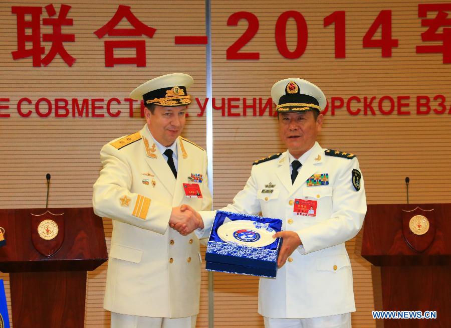 Directors of "Joint Sea-2014" drill from China and Russia exchange gifts at the closing ceremony of the China-Russia joint naval drill in Shanghai, east China, May 26, 2014. The directors of two sides announced the end of the drill here on Monday. (Xinhua/Zha Chunming)