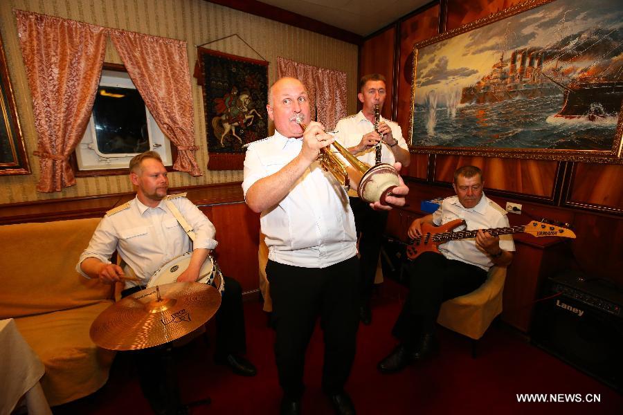 A band performs during a reception held on the Russian guided missile cruiser Varyag in Shanghai, east China, May 19, 2014. Chinese and Russian naval forces held interchange activities on Monday to enhance mutual communication. (Xinhua/Zha Chunming)