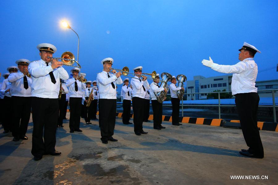 A Russian Naval Military band perform before a reception held on the Russian guided missile cruiser Varyag in Shanghai, east China, May 19, 2014. Chinese and Russian naval forces held interchange activities on Monday to enhance mutual communication. (Xinhua/Zha Chunming)