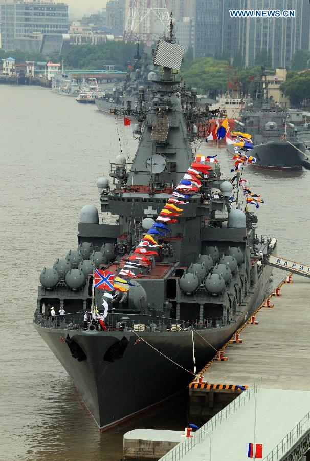 Flags fly on Russian guided missile cruiser Varyag in Shanghai, east China, May 19, 2014. Chinese and Russian naval forces held interchange activities on Monday to enhance mutual communication. (Xinhua/Zha Chunming)