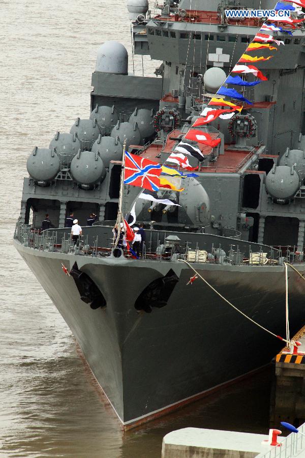 Flags fly on Russian guided missile cruiser Varyag in Shanghai, east China, May 19, 2014. Chinese and Russian naval forces held interchange activities on Monday to enhance mutual communication. (Xinhua/Zha Chunming)
