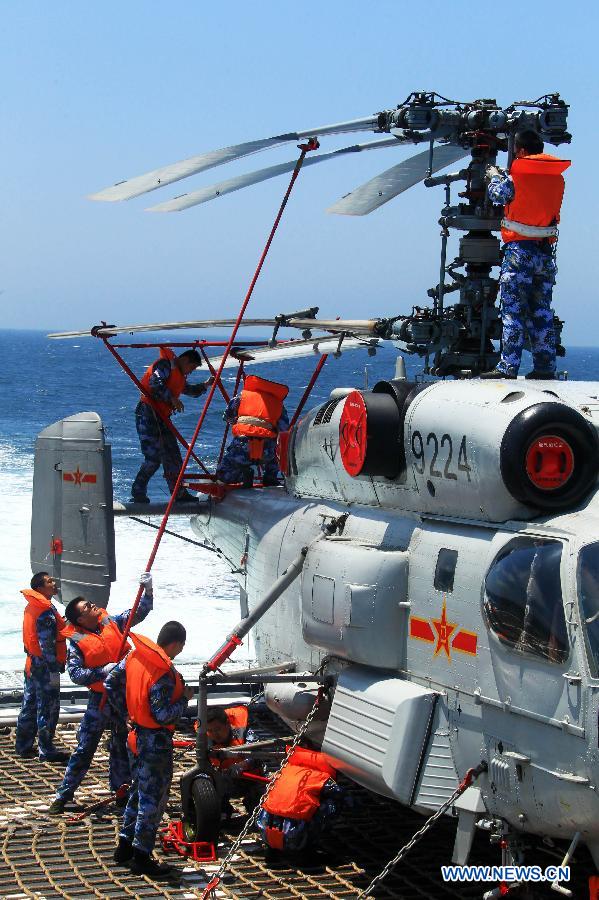 Chinese Navy soldiers work on a helicopter before sending it into hangar on China's Zhengzhou missile destroyer during the China-Russia joint naval drill on East China Sea, May 24, 2014. The three-day drill "Joint Sea-2014" ended successfully on Saturday. The Chinese and Russian navies staged exercises, including joint escort drill, joint aircraft identification exercise and air defense and maritime assault drills. (Xinhua/Zha Chunming)